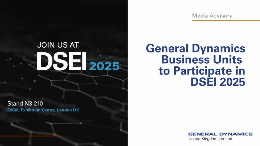 LONDON, UK—Three business units of General Dynamics will be among the exhibitors at Defence and Security Equipment International September 9 to 12, 2025, at the Excel Centre, in London, England.